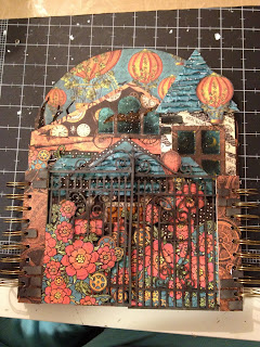 It is a gate mini album, each layer is a different part of the house, gate entry (still to come), porch, tower, main house section, then the moon lite graveyard. Graphic 45 works great for this project lots of items that can fuzzy cut to add dimension and overall funky-ness (new word maybe it will be added to websters like twerk) the back side of pages will be for photos and journaling.
